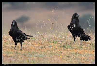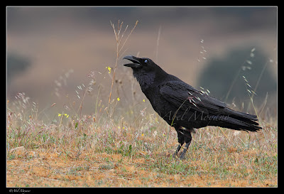 Así es el cuervo común "Corvus corax", de los primeros en llegar al lugar donde hay restos de animales o carroña para ingerir, dado su carácter omnívoro, y que inmediatamente se encarga de difundir su ubicación para el resto de carroñeros, ya que por sus vuelos y sus graznidos, pone en alerta a todo el que pase por allí.