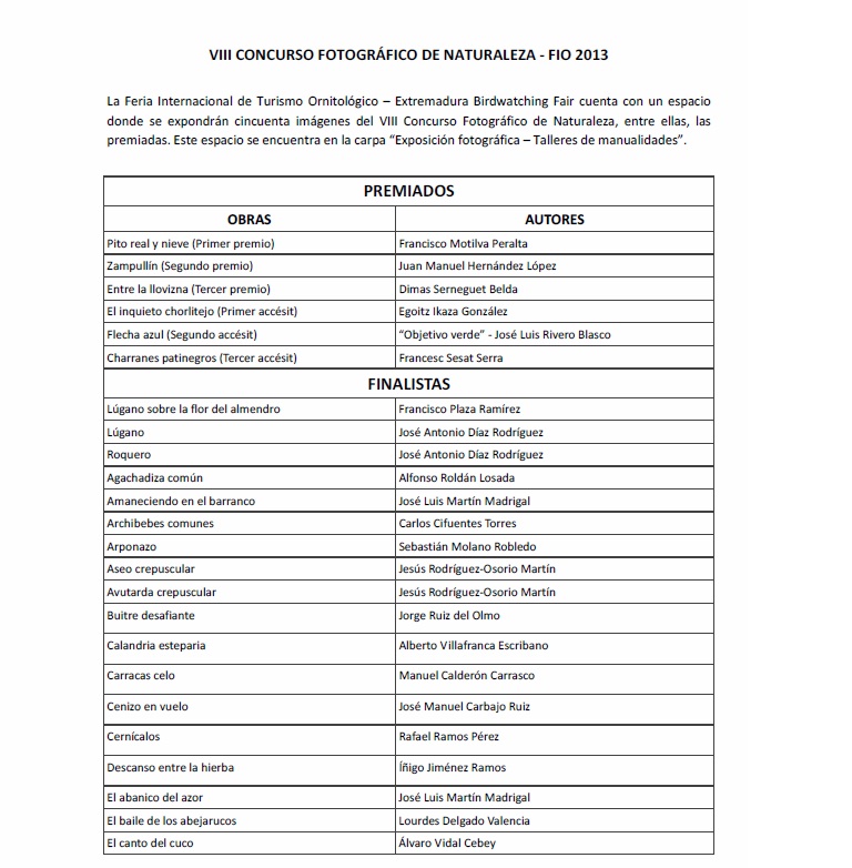 motivo de la FIO 2013 Feria Internacional de Turismo Ornitológico - Extremadura Birdwatching Fair (FIO), que celebra su 8ª edición del 1 al 3 de marzo de 2013 en Villareal de San Carlos (Parque