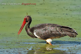 Si en la entrada anterior veíamos a unos pollos de cigüeña negra, ahora toca el turno de los adultos; aqui el marrón oscuro de edades tempranas de las plumas torna en negro irisado metálico y el rojo intenso gana al marron del pico y a la vez a la parte que rodea al ojo (carúncula) adopta también un color rojo ; esperemos verlas a partir del mes de marzo del año que viene por nuestra zona.